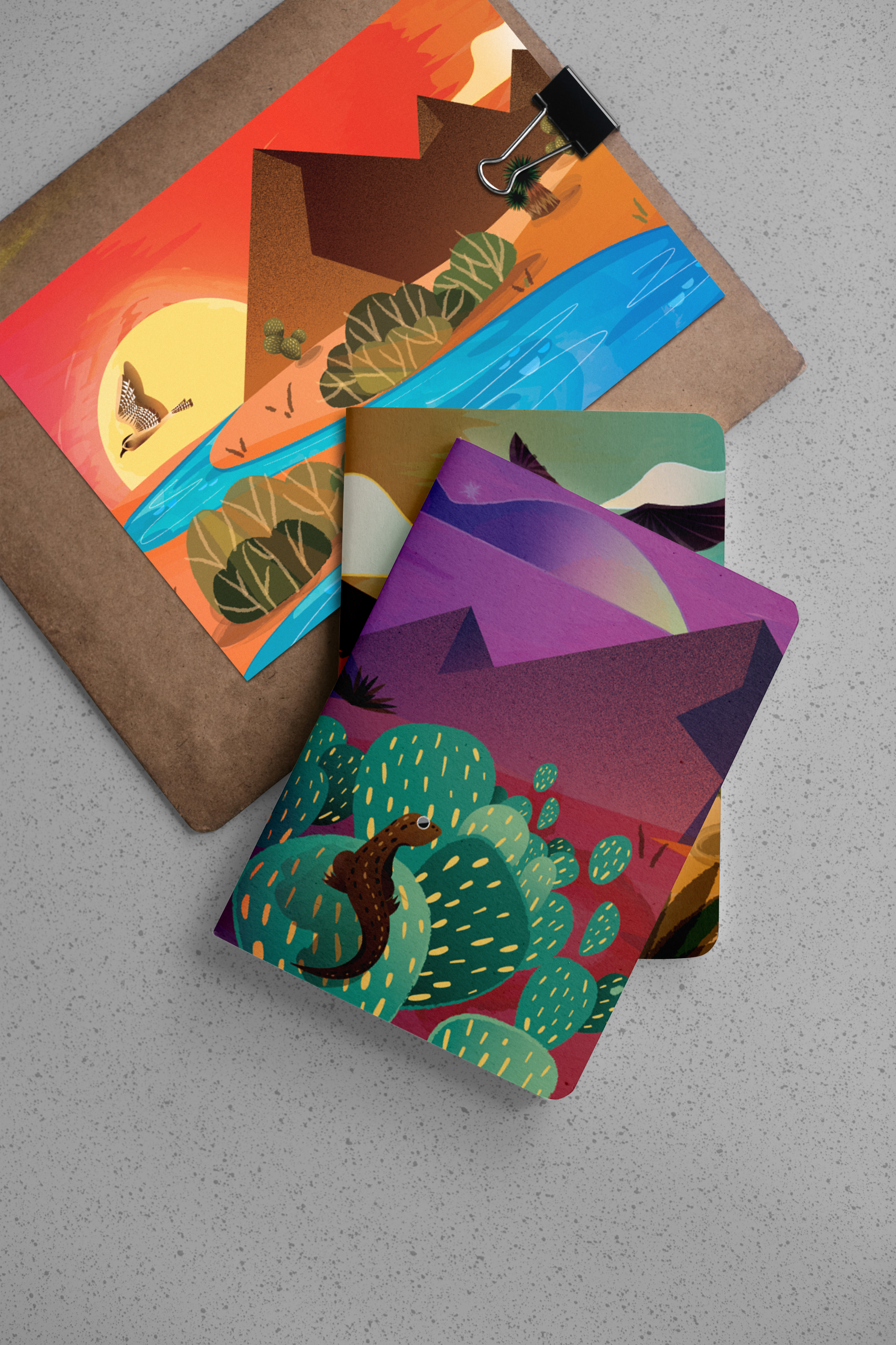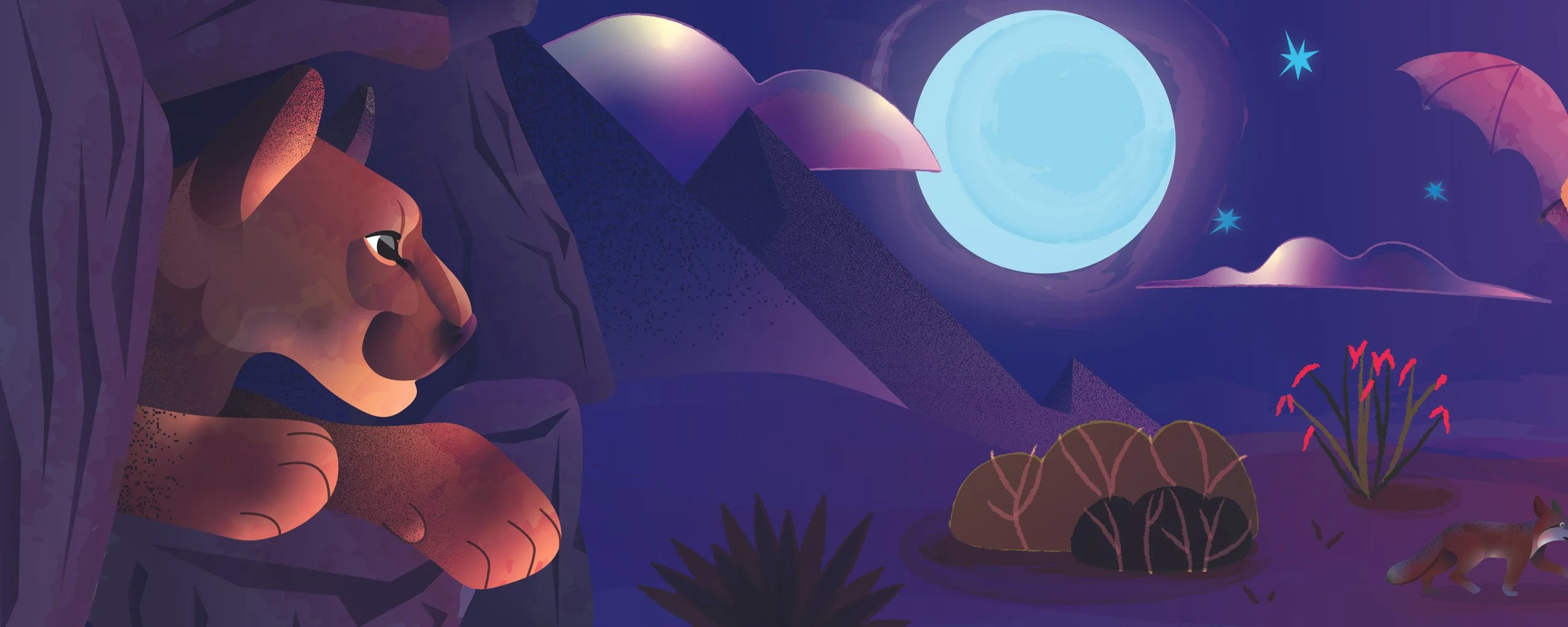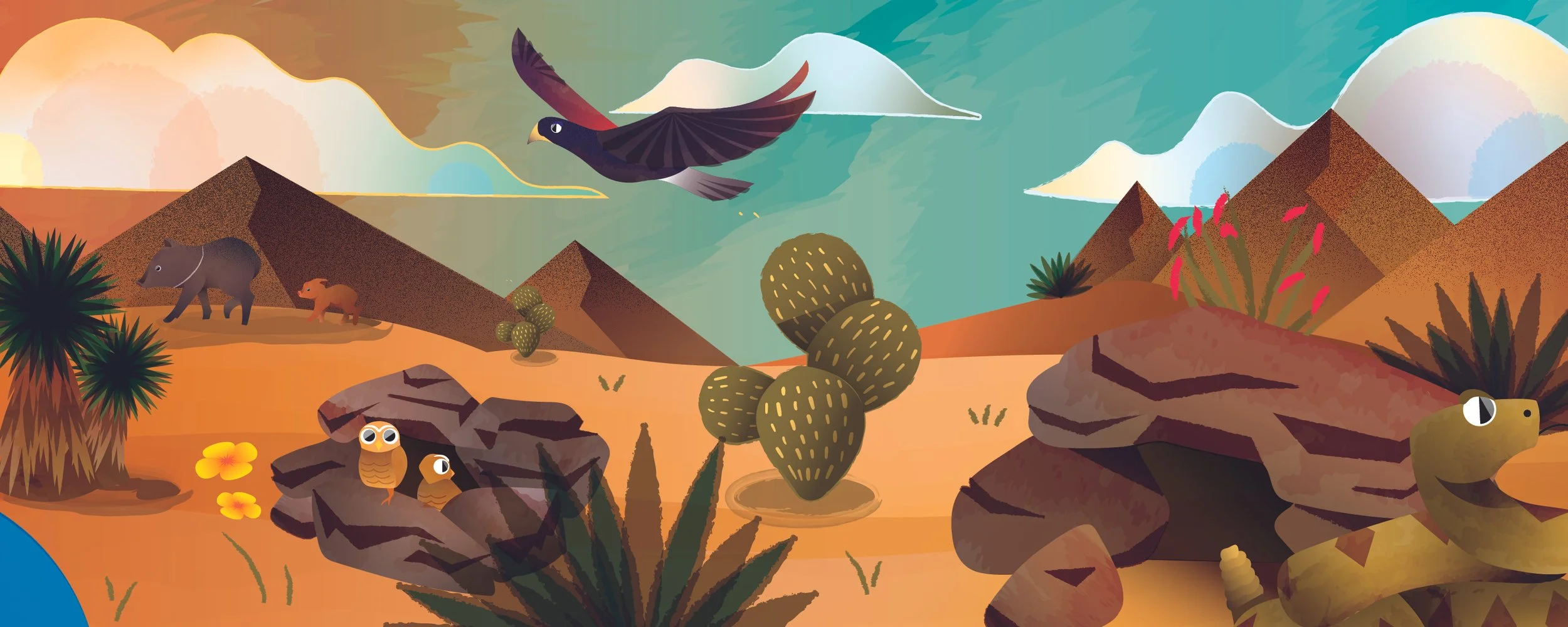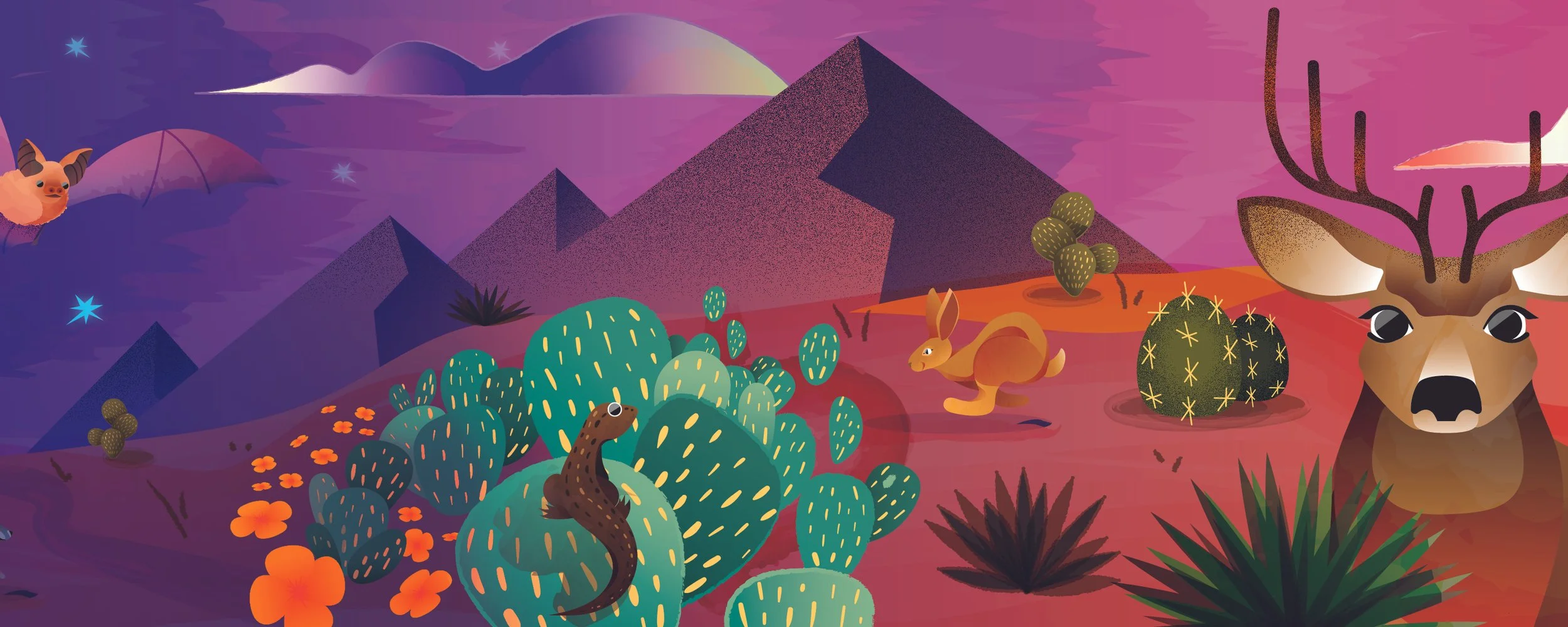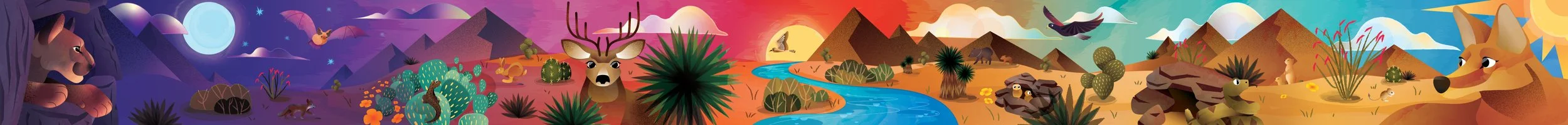 I designed the illustration specifically for the space. Since visitors enter this area of the museum from right to left, the mural begins with a morning scene on the right and transitions into evening as you move left. It features a range of flora and fauna found in the Chihuahuan Desert.