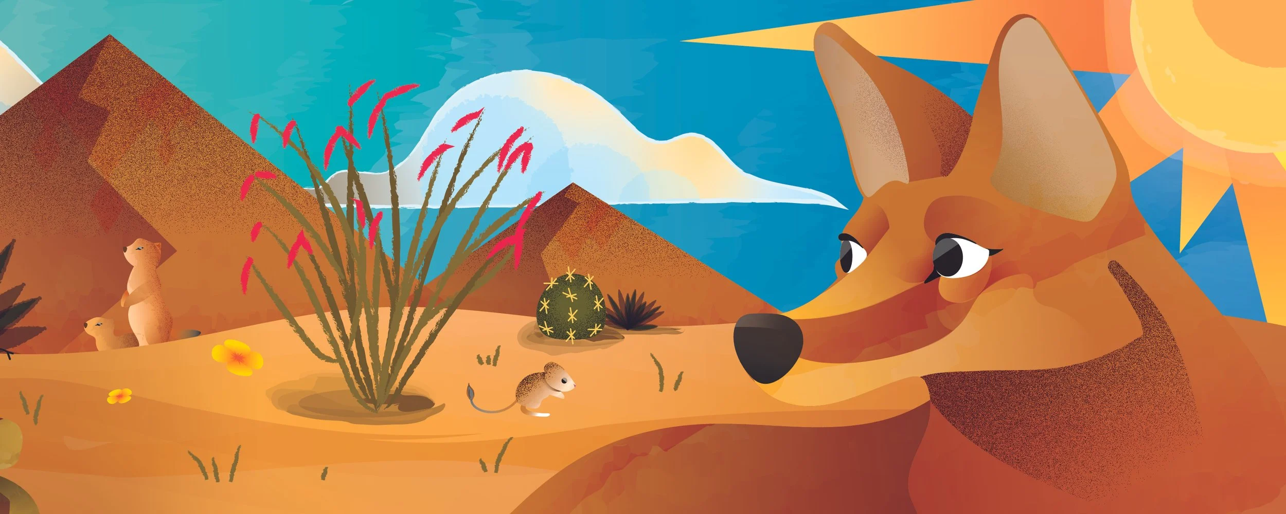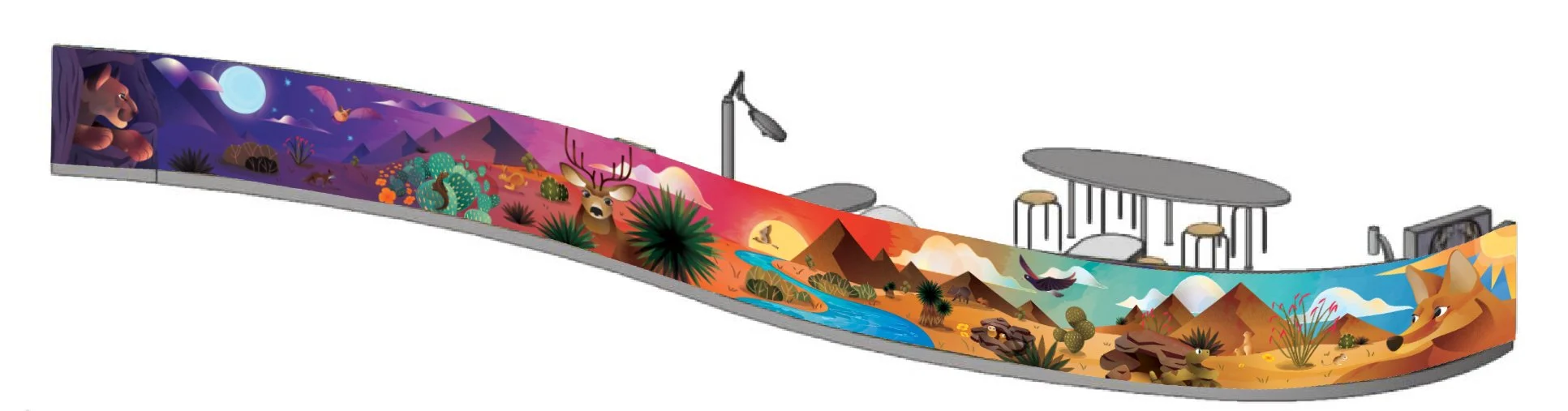 A 50’ x 4’ mural illustrating the Chihuahuan Desert and its range of animal life. The design moves from morning to night, reflecting the desert’s shifting light. Key elements are created as modular assets that can be repurposed for billboards, merchandise, and other collateral.