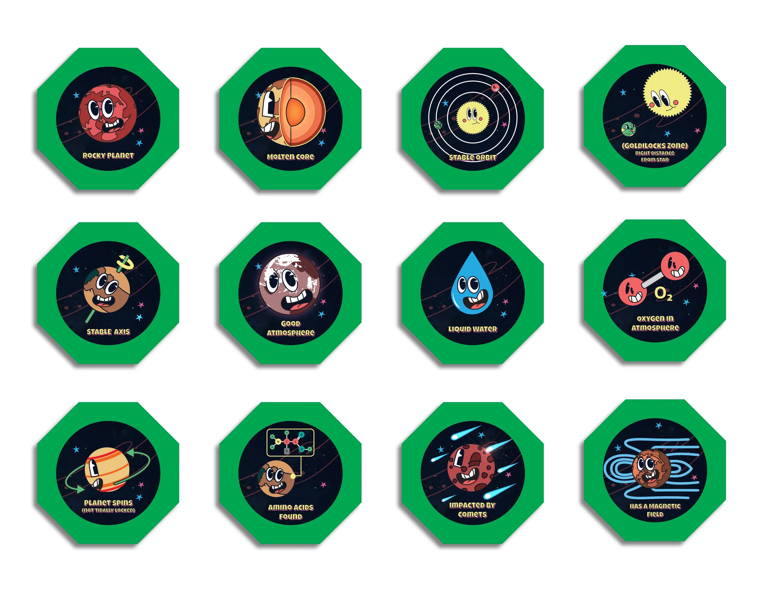 These illustrations were created for an exhibit interactive where patrons line up 4 positive situations to sustain life on their exoplanet. Opponents can also block the exoplanets habitability by placing a negative situation.