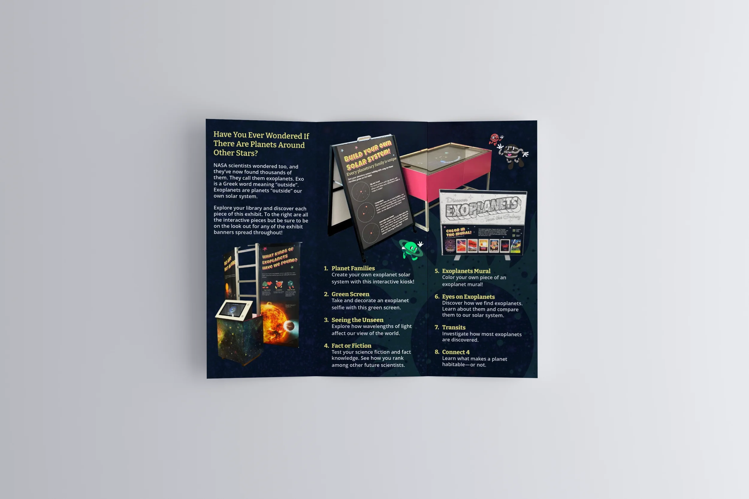The client required graphics and illustrations for the traveling exhibition that complemented the existing content and NASA-supported resources. The target audience includes children, teens, and families. Deliverables included exhibit graphics, supporting illustrations, and formatted educational materials that helped libraries engage their communities in learning about exoplanets.