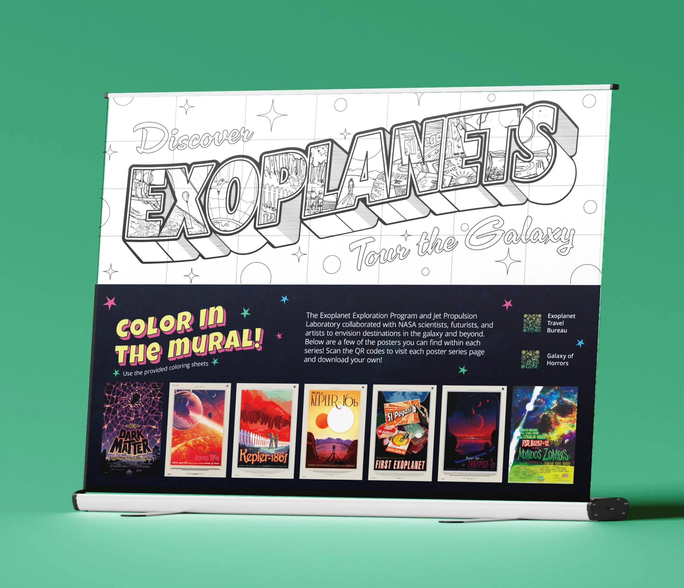The exhibit aimed to creatively display the projects of NASA's Jet Propulsion Library. Utilizing posters designed by NASA JPL, a standalone banner was crafted to form a mural for library visitors to color. Drawing from the theme of "travel" depicted in the posters, the ultimate design was influenced by vintage travel postcards.